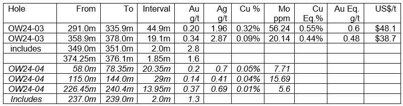 Notes on Table 1: Assay >0.1% Cu, were grouped to form the intervals in table 1 where they were continuous with no gaps <0.1% Cu over 6m. To illustrate mineralized zones to aid in geological interpretation some intervals >0.1% Cu equivalent have been also included, especially for OW24-04. Copper equivalents are given for comparison purposes only. The equivalents are calculated based on the following US$ price assumptions: copper, US$4 per pound, US$8,818 per tonne; gold, US$2,500 per troy ounce, US$80 per gram; silver, US$30 per troy ounce, US$0.96 per gram; and molybdenum, US$20/kg. The copper equivalent is based on adding the US$/t values of Au + Ag + Mo together calculating what percentage copper this total represents and then adding this to the assayed Cu% value. It assumes 100% recovery which will not be achievable if mined and processed. The gold equivalent is calculated in a similar manner. Varying commodity prices will alter the copper and gold equivalent values. Samples were taken at a nominal 2m interval of diamond saw split HQ size core.