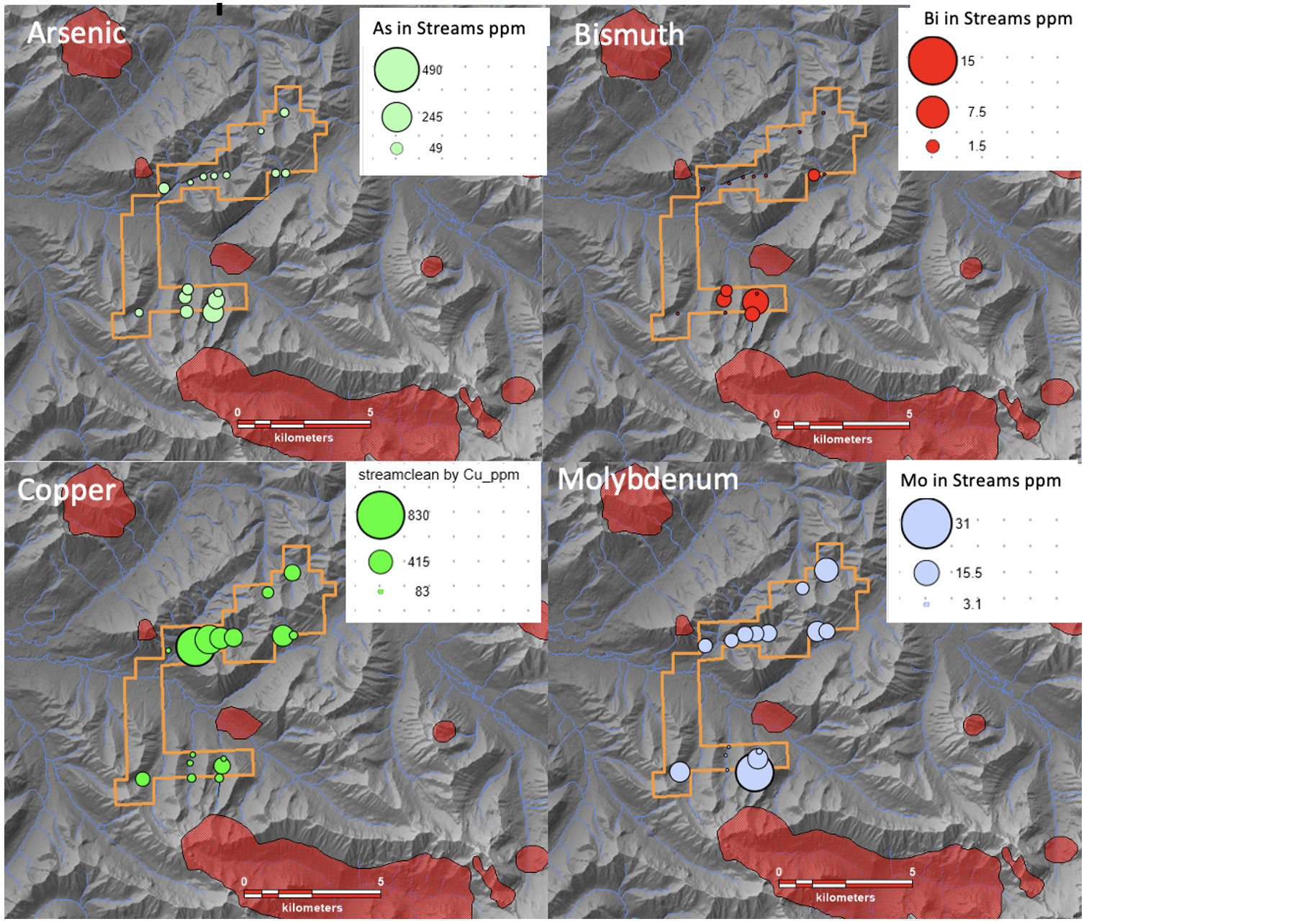 Figure 5: Stream sediment sampling: prominent pathfinder elements, arsenic, bismuth, copper and molybdenum. Note that sulphur, antimony, silver and zinc are also anomalous, not shown for brevity. Some zonation is seen, with arsenic, bismuth and molybdenum more prominent in the south, and copper, molybdenum and zinc in the northwest.